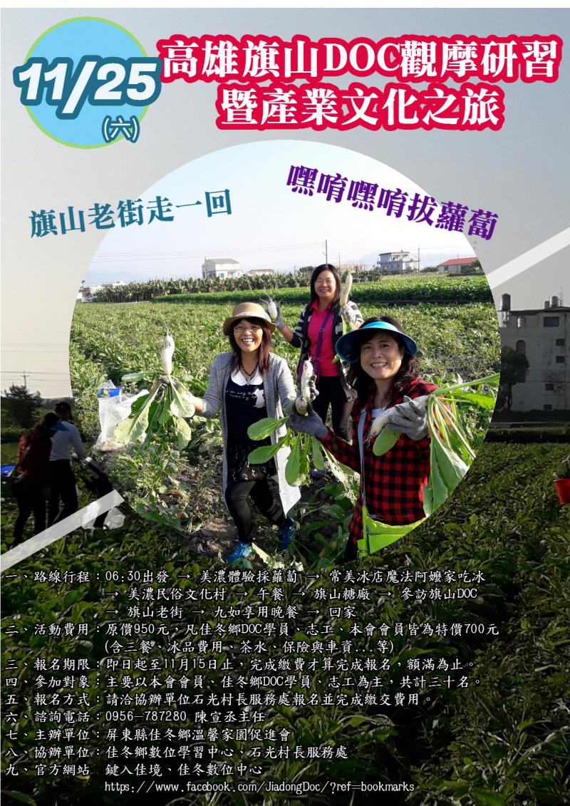 最新消息 DOC快訊 ::: <上一則 返回列表 下一則> 辦理旗山DOC觀摩暨在地產業之旅 發布日期:2017-10-16 人氣:411 佳冬DOC辦理外縣市數位中心參訪暨產業文化觀摩活動!歡迎數位中心的學員、會員以及志工們踴躍來報名參加喔! <上一則 返回列表 下一則>