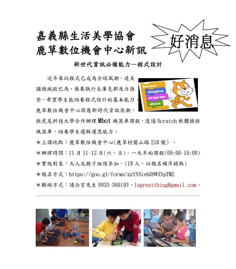 最新消息 DOC快訊 ::: <上一則 返回列表 下一則> 【免費Mbot程式設計機器車】課程熱烈報名中 發布日期:2017-10-29 人氣:630 免費Mbot程式設計機器車課程,讓您成為一名數位設計高手,鹿草DOC邀您一起來學習程式設計遙控機器車。線上報名:https://goo.gl/forms/XRqTVIljrfZeTAaC3 <上一則 返回列表 下一則>