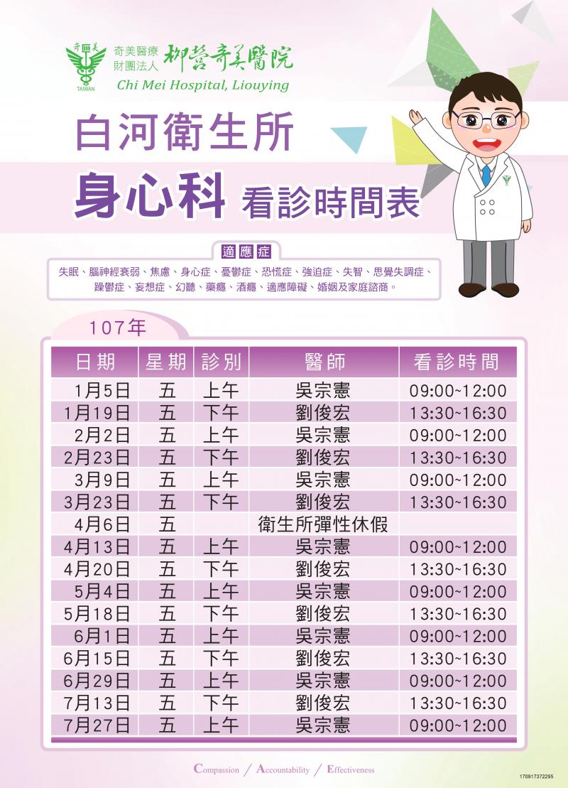 最新消息 DOC快訊 ::: <上一則 返回列表 下一則> 柳營奇美醫院於106年9月起至白河區衛生所增設「精神科巡迴醫療門診」,看診免收掛號費,歡迎民眾利用 發布日期:2017-11-30 人氣:676 柳營奇美醫院於106年9月起至白河區衛生所增設「精神科巡迴醫療門診」,藉由社區巡迴醫療門診,協助改善偏遠地區病人就醫不便之苦。診療項目有:失眠、腦神經衰弱、焦慮、身心症、憂鬱症、恐慌症、強迫症、失智、思覺失調症、 躁鬱症、妄想症、幻聽、藥癮、酒癮、適應障礙、婚姻及家庭諮商等。 白河區精神科巡迴醫療門診免收掛號費,地點及服務時間為:白河區衛生所每隔一周的星期五(每次門診分為上午診或下午診,每月2診次,詳如附檔),可於網路預約掛號或到現場掛號。 <上一則 返回列表 下一則>
