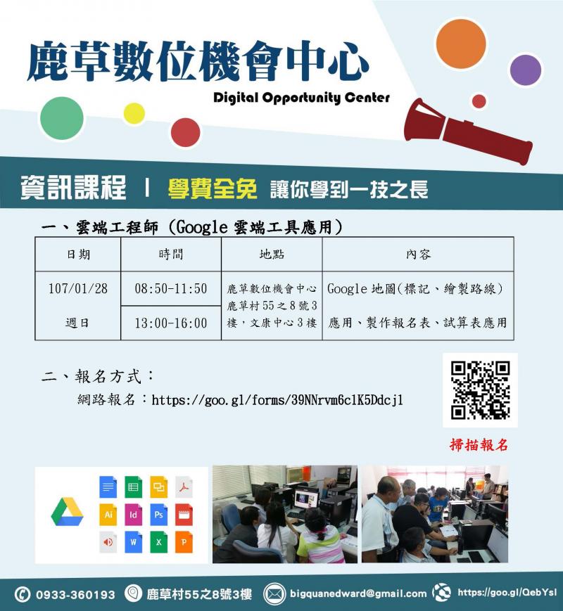 最新消息 DOC快訊 ::: <上一則 返回列表 下一則> 2018 鹿草DOC 資訊課程 1月課程報名表 發布日期:2018-01-17 人氣:416 2018 鹿草DOC 資訊課程- 雲端工程師 時間:2018/01/28 週日 地點:鹿草數位機會中心 ( 嘉義縣鹿草鄉鹿草村55之8號 文康中心3樓 ) Google雲端教學課程: 1、Google Map 2、Google 表單 線上報名 https://goo.gl/forms/39NNrvm6c1K5Ddcj1 <上一則 返回列表 下一則>