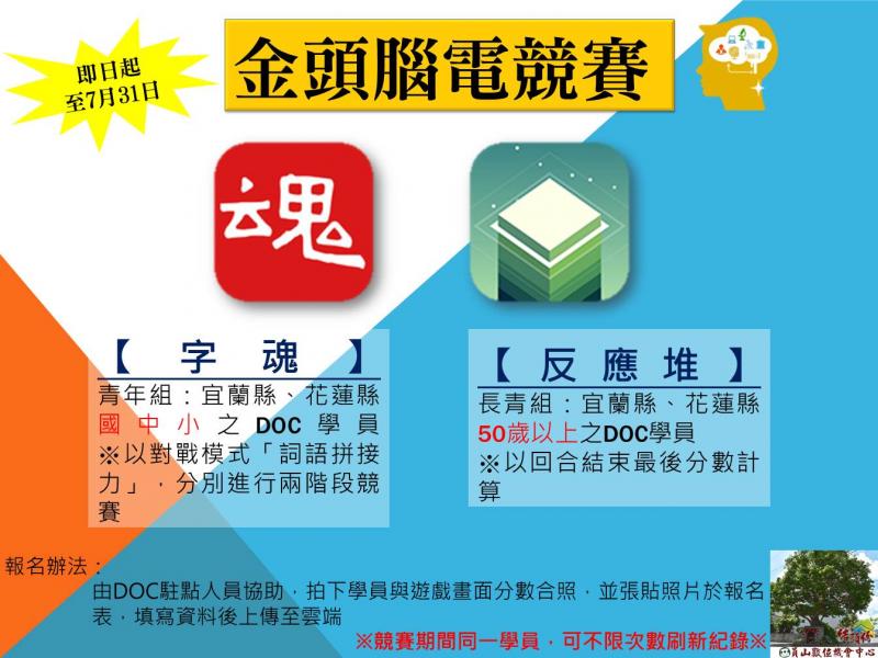 ⬜「長青組」搭配平板課程推廣,使用競賽遊戲Stack(反應堆)與Stack It AR。「青年組」搭配進用計劃課程平板借用推廣,使用競賽遊戲「字魂」,以對戰模式「詞語拼接力」,分別進行兩階段競賽。競賽優勝之DOC學員可獲得精美好禮。
