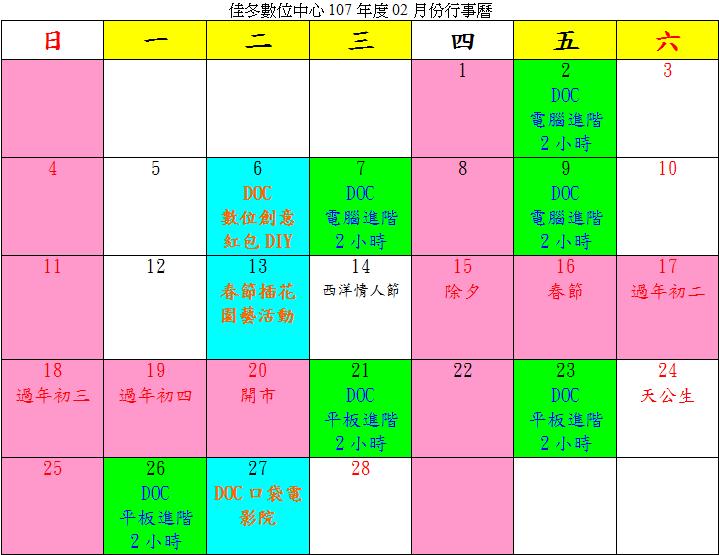 行事曆顏色備註: