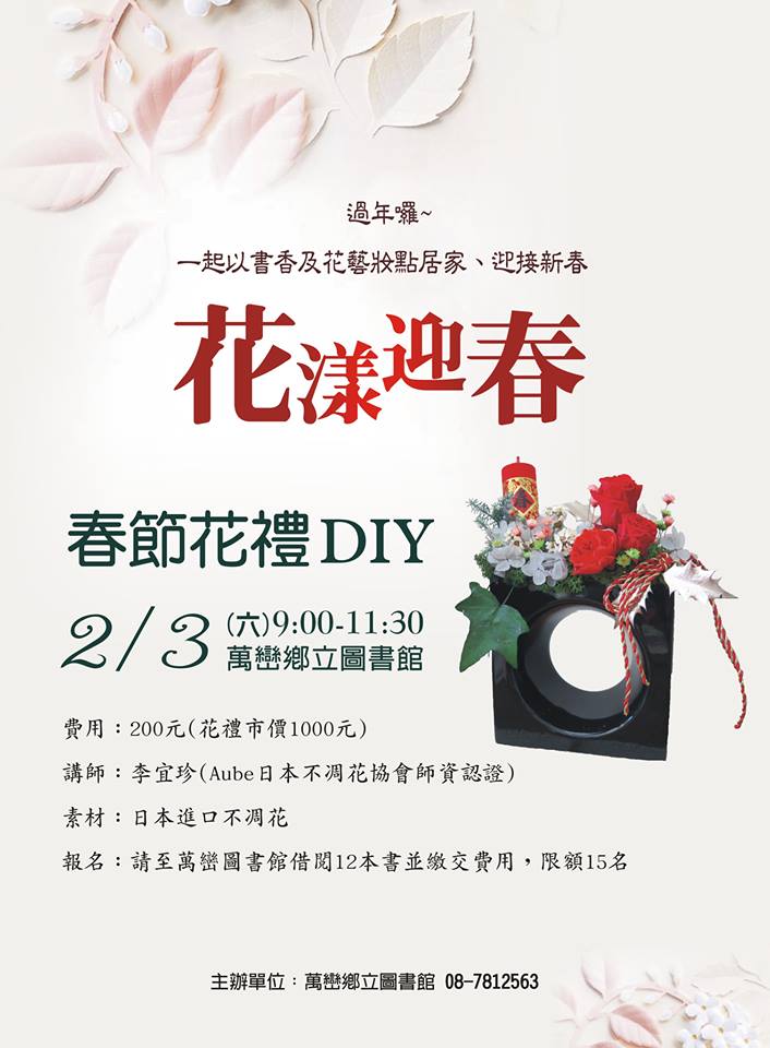 最新消息 DOC快訊 ::: <上一則 返回列表 下一則> 【花漾迎春】春節花禮DIY 發布日期:2018-01-31 人氣:232 開春好禮【花漾迎春】,市價千元的不凋花禮,來巒圖借12本書+費用200元,就可以參加優雅美麗的春節花禮課程 一起用書香及花藝妝點居家、迎接新春! 時間│107.2.3(六)上午9:00-11:30 講師│李宜珍(Aube日本不凋花協會認證講師) 素材│日本進口不凋花 費用│200元 報名│1/27起至萬巒圖書館借閱12本書並繳交費用,額滿截止 ................................................ 【不凋花簡介】 不凋花在台灣又稱為恆星花或永生花,在鮮花盛開最美麗時特殊加工,適當環境下保存得好超過五年也不會凋謝。 具有如鮮花般的柔軟度與保有水分的觸感,每一朵都是獨特的姿態。不凋花會依擺放的時間、氣溫、溼度慢慢改變顏色,千變萬化也是它的特色之一。 <上一則 返回列表 下一則>