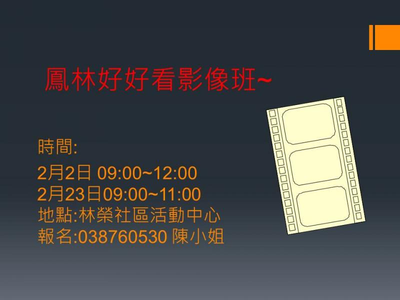 最新消息 DOC快訊 ::: <上一則 返回列表 下一則> 鳳林好好看影像班~ 發布日期:2018-02-01 人氣:128 2月2日 09:00~12:00 2月23日09:00~11:00 地點:林榮社區活動中心 <上一則 返回列表 下一則>