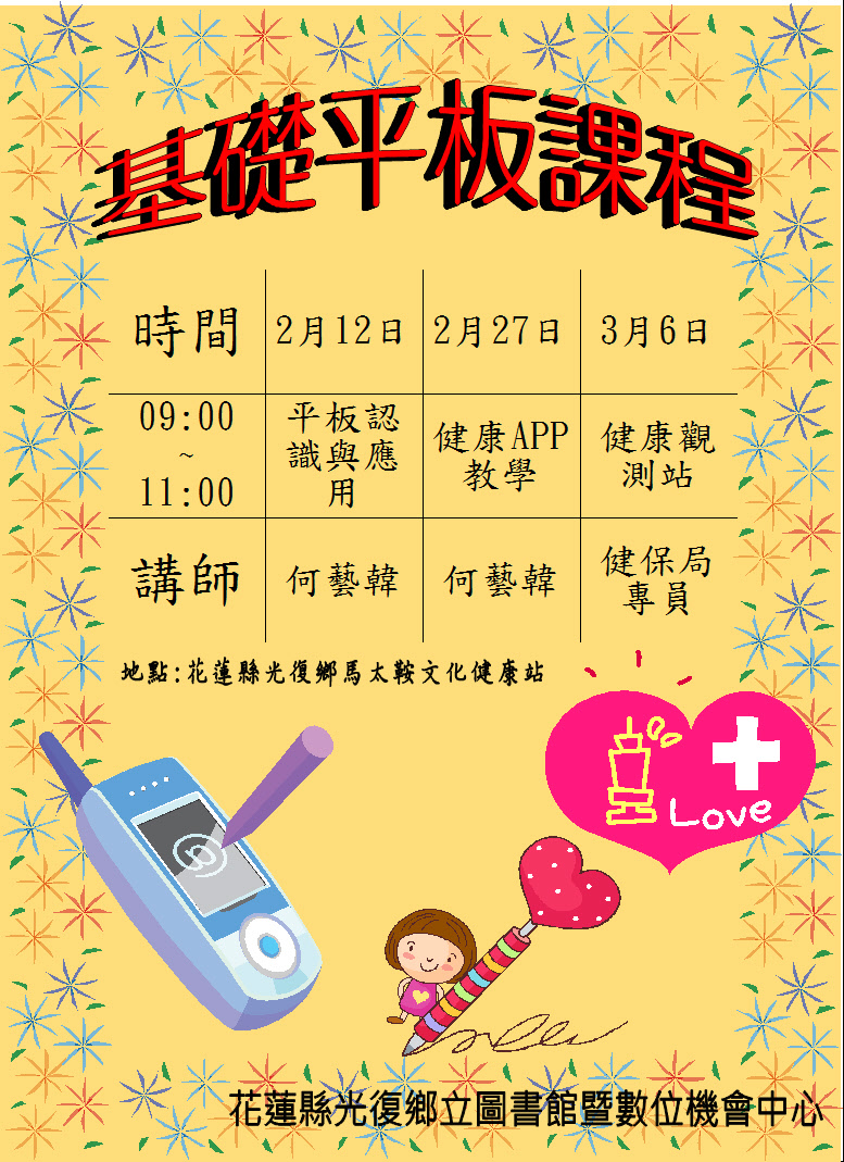 最新消息 DOC快訊 ::: <上一則 返回列表 下一則> 光復圖書館暨數位機會中心【社區課資訊公告】 發布日期:2018-02-08 人氣:108 親愛的鄉親及學員 本年度第一堂數位中心課程,不學可惜! 課程資訊如下 課程名稱:樂活E起來 上課時間:2/12,2/27,3/6 上課地點:花蓮縣光復鄉馬太鞍文化健康站 報名請至光復圖書館暨數位機會中心請專人服務 <上一則 返回列表 下一則>
