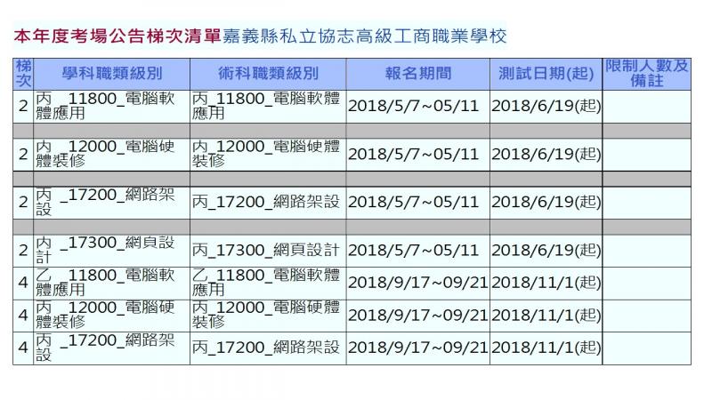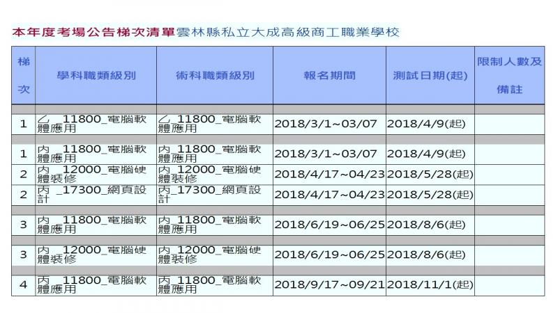 最新消息 DOC快訊 ::: <上一則 返回列表 下一則> 107年乙丙級技術士電腦軟硬體檢定開始招生上課公告 發布日期:2018-03-03 人氣:362 107年乙丙級技術士電腦軟硬體檢定開始招生上課公告: 乙軟上課地點: 橋頭DOC 課程時間:每週六上午九點至下午四點密集式上課 餅軟上課地點:橋頭DOC或麥寮鄉立圖書館 課程時間:先報名另行通告上課時間 檢定日期:配合各考場時間如下圖示參考(配合學員練習程度決定報考梯次時間 檢定費用:(依政府規費收取)材料費依級等不同酌收費用(使用者付費)報名詢問 <上一則 返回列表 下一則>