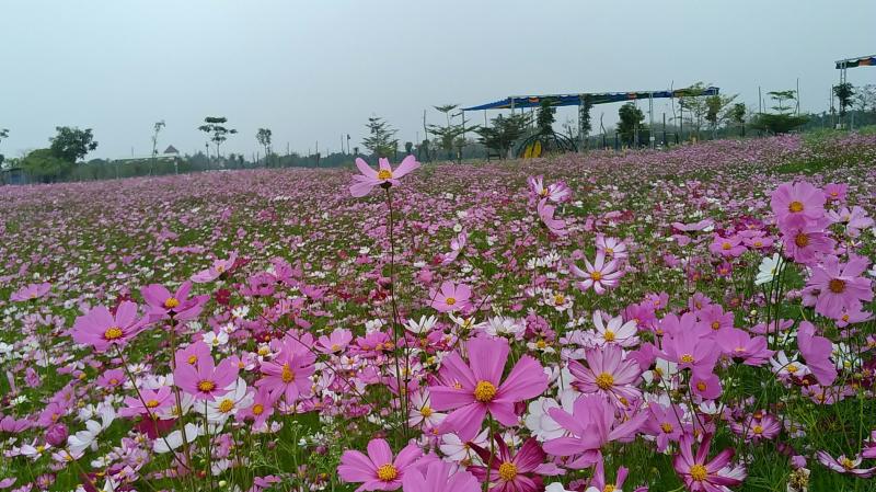 位於台一線戰備跑道旁的「佳冬運動公園」,從過年後至今,盛開了一大片的波斯菊花海,繽紛的色系吸引了許多路過的遊客蒞臨參觀。