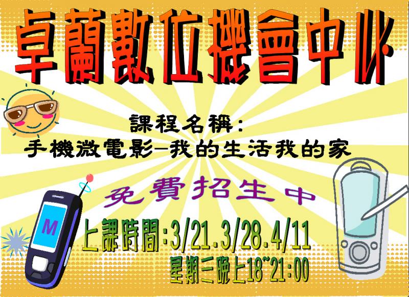 最新消息 DOC快訊 ::: <上一則 返回列表 下一則> 手機微電影-我的生活我的家 發布日期:2018-03-19 人氣:269 課程時間:3/21(三).3/28(三).4/11(三)18:00~21:00 上課地點:卓蘭數位機會中心 (卓蘭國小4樓電腦教室) 上課內容:行動App錄影. 文案主題發想. 手機微電影剪輯 歡迎電詢卓蘭數位機會中心駐點人員詹雅琦 0988-822464 黃群淵老師 04-25892008*713 <上一則 返回列表 下一則>