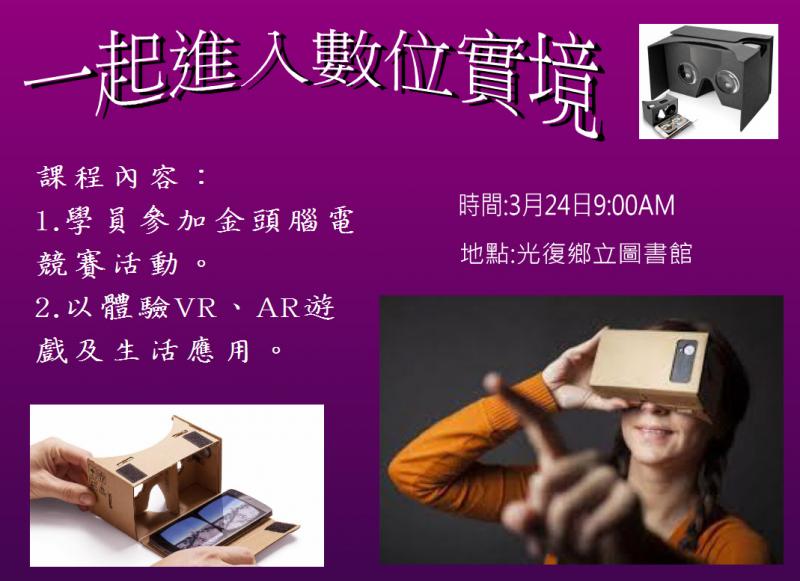最新消息 DOC快訊 ::: <上一則 返回列表 下一則> 光復圖書館暨數位機會中心【課程資訊公告】 發布日期:2018-03-21 人氣:144 本次課程因與其他活動相衝突,故改期至四月中旬辦理。 需要詳細報名資訊請洽詢光復鄉立圖書館03-8702111 上課日期:2018-03-24 上課時間: 09:00~ 12:00 上課地點:光復圖書館 簡單的VR、AR遊戲體驗及相關應用介紹 <上一則 返回列表 下一則>