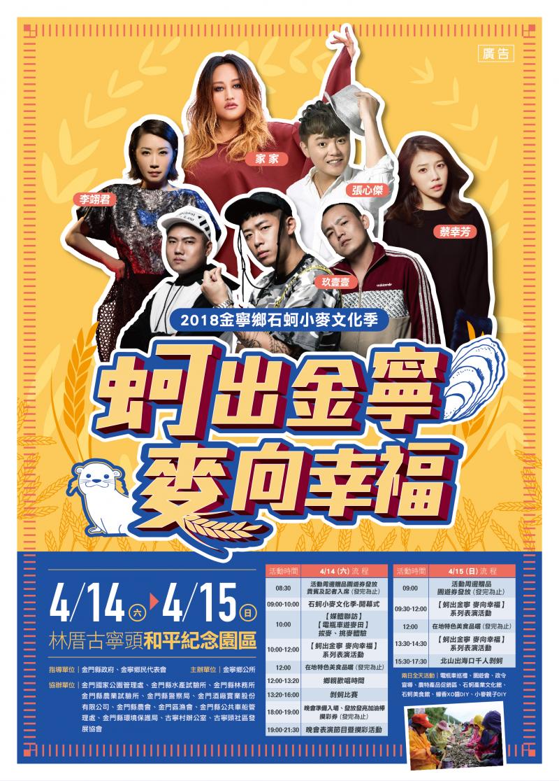 金寧鄉公所訂於4月14日、15日兩天,假「古寧頭林厝和平園區」舉辦「2018石蚵小麥文化季」,配合活動將推出園遊會活動,提供40個攤位,以金寧地區鄉民之農特產、特色小吃、金門文創商品等業者優先報名,並自明(廿一)日起上班時間開始受理現場報名,額滿為止,歡迎有意願報名之業者自行前往金寧鄉公所農觀課現場報名,恕不接受電話報名。