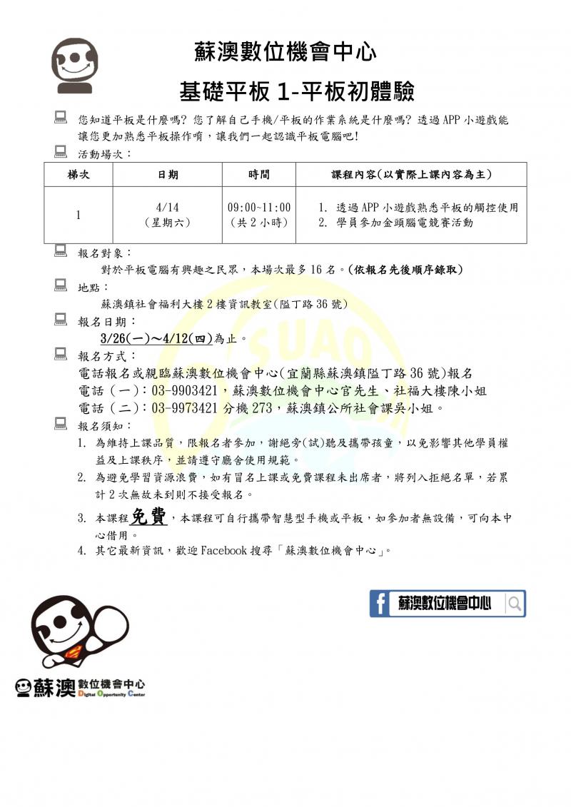 電話(一):03-9903421,蘇澳數位機會中心官先生或社福大樓陳小姐(週一休館)。