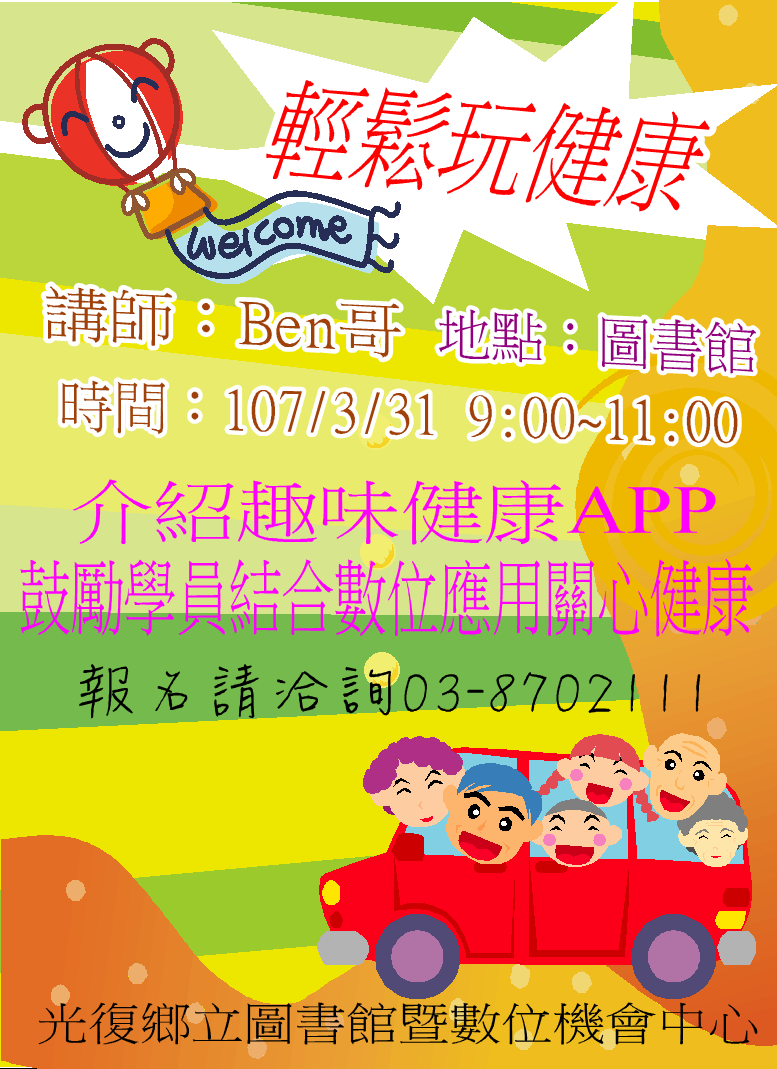 最新消息 DOC快訊 ::: <上一則 返回列表 下一則> 光復圖書館暨數位機會中心【課程資訊公告】 發布日期:2018-03-27 人氣:104 親愛的鄉親父老及學員姐姐哥哥阿姨叔叔 【輕鬆玩健康】課程開始報名囉~~ 透過數位活動來瞭解自己的健康狀況吧~~ 需要詳細報名資訊請洽詢光復鄉立圖書館03-8702111 上課日期:2018-03-31 上課時間: 9:00~ 11:00 上課地點:光復圖書館 介紹趣味健康APP ,鼓勵學員結合數位應用關心健康 <上一則 返回列表 下一則>