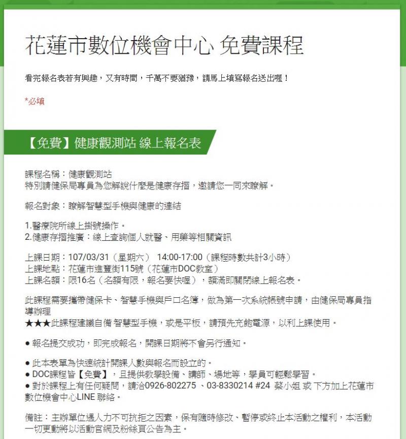● 對於課程上有任何疑問,請洽0926-802275 、03-8330214 #24 蔡小姐 或 下方加上花蓮市數位機會中心LINE 聯絡。