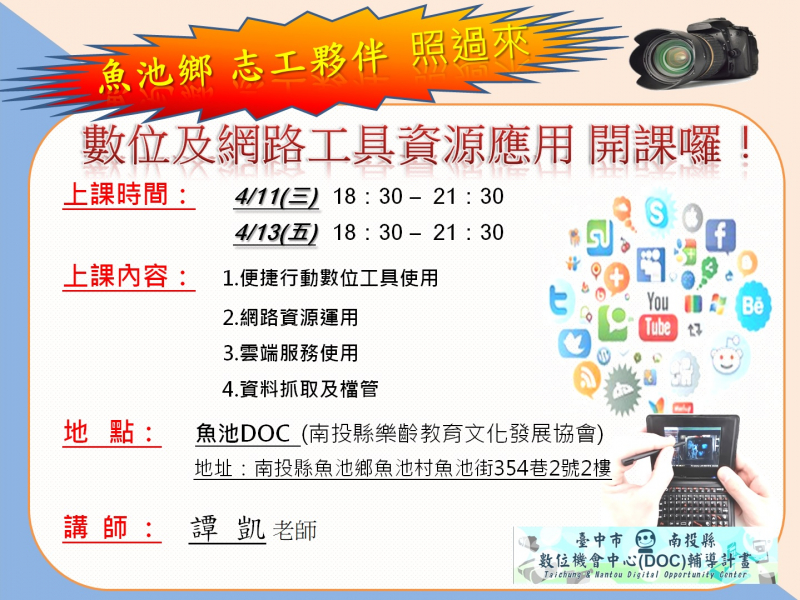 最新消息 DOC快訊 ::: <上一則 返回列表 下一則> 魚池DOC 志工數位及網路工具資源應用課程 發布日期:2018-03-26 人氣:183 提供志工們及鄉親們 未來活動使用的數位及網路工具相關資源應用 課程,以便協助DOC活動宣傳 以及 鄉里活動時皆能應用! <上一則 返回列表 下一則>