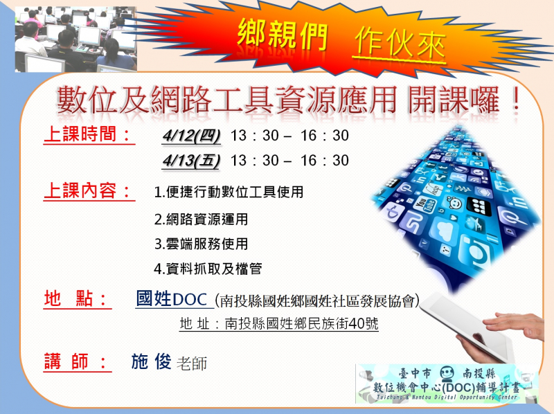 最新消息 DOC快訊 ::: <上一則 返回列表 下一則> 國姓鄉DOC 志工數位及網路工具資源應用課程 發布日期:2018-03-29 人氣:207 提供志工們及鄉親們 未來活動使用的數位及網路工具相關資源應用 課程,以便協助DOC活動宣傳 以及 鄉里活動時皆能應用! <上一則 返回列表 下一則>