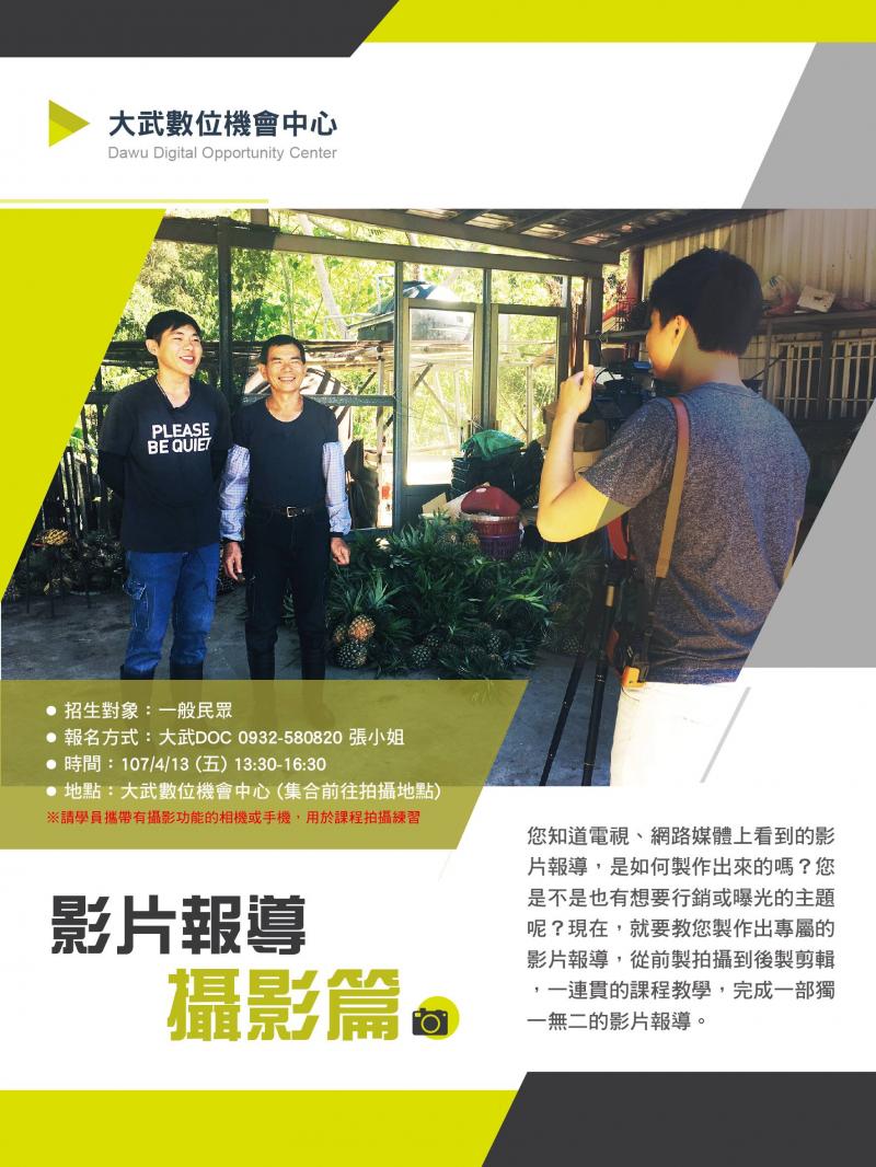 最新消息 DOC快訊 ::: <上一則 返回列表 下一則> 大武DOC開課:影片報導-攝影篇 發布日期:2018-04-02 人氣:208 你知道電視、網路媒體看到的影片報導嗎?你是不是也有想曝光或行銷的主題呢?大武Dic提供您學習的課程,就在4月13日(星期五)下午1時30分Doc教室集合,從拍攝、排版到剪輯,專業講師教你完成獨一無二的影片,報名專線0932580820張小姐 <上一則 返回列表 下一則>