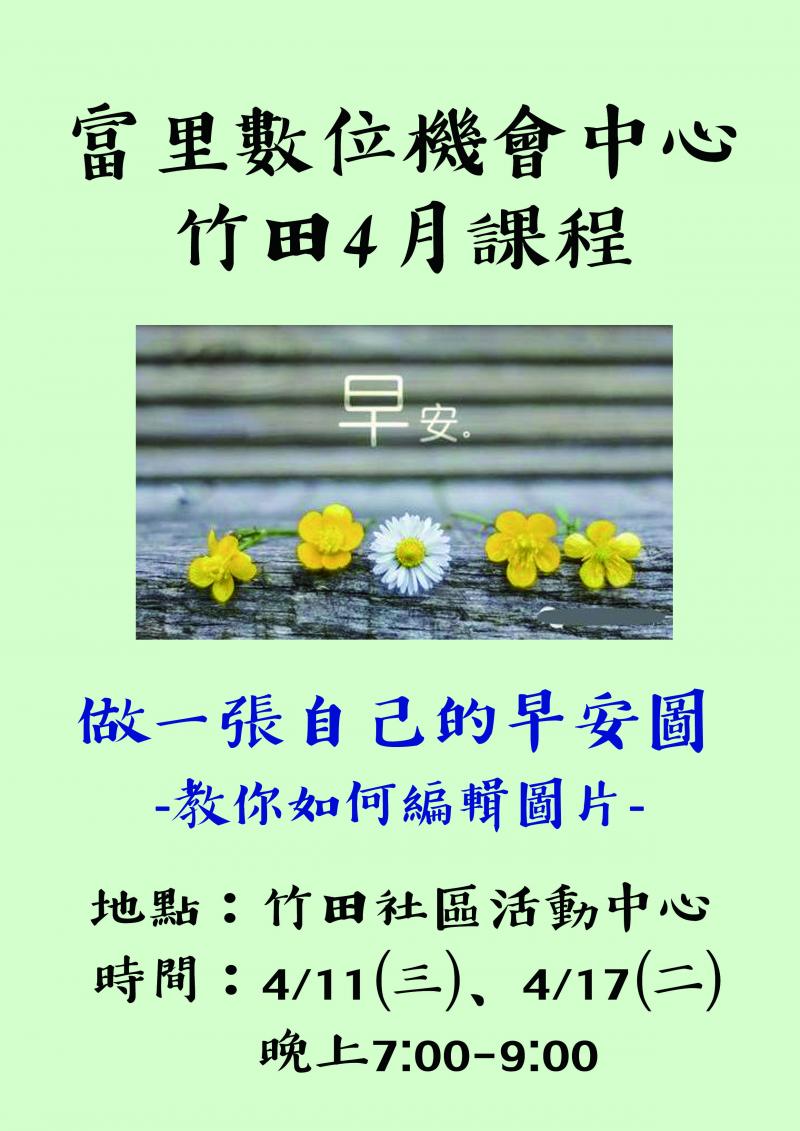 最新消息 DOC快訊 ::: <上一則 返回列表 下一則> 富里DOC課程訊息:做自己的早安圖(竹田4月課程) 發布日期:2018-03-30 人氣:431 竹田3月的課程已經順利結束囉! 謝謝一起參與的大家~ 清明節大家好好休息一下, 放假完後再帶著滿滿的能量回來! 4月要教大家做自己的早安圖, 不只這樣, 還要學會用手機或平板簡單編輯自己的照片, 做出屬於自己獨一無二的圖片喔! 地點:竹田社區活動中心 時間:4/11(三)、4/17(二)晚上7:00-9:00 <上一則 返回列表 下一則>