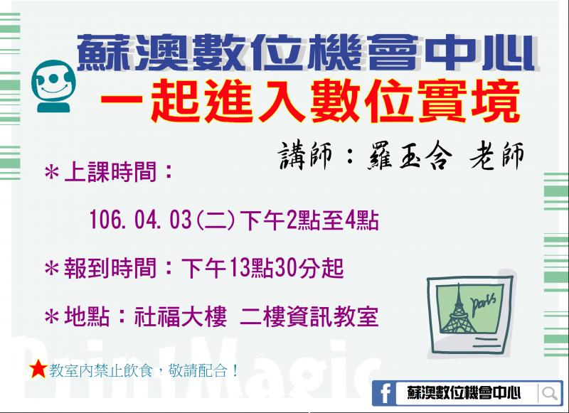 最新消息 DOC快訊 ::: <上一則 返回列表 下一則> 【課程提醒】0403- 一起進入數位實境 發布日期:2018-04-02 人氣:205 有報名「0403- 一起進入數位實境」的學員,請記得4/3(二)下午2點要來上課哦(報到時間從下午1點30分開始)!! *教室內禁止飲食,敬請配合 *可攜帶紙筆方便學習紀錄 *如臨時有事無法前來,請主動來電取消 *本課程僅提供報名成功者參加,候補者請等待電話通知,現場不開放現場報名,不便之處敬請見諒 ※ 前測問卷 後側問卷 <上一則 返回列表 下一則>