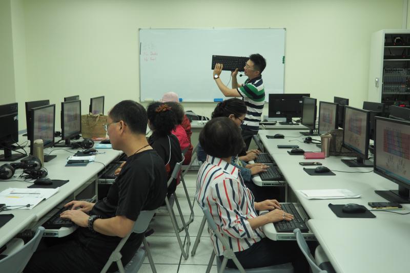「電腦操作入門」由林琨庭老師講課,從介紹開機、關機、鍵盤滑鼠…功能操作,老師一步一步很仔細教導學員們使用鍵盤,清楚說明指法位置以及手指的應用,再打開Word請學員們練習字母打字(也介紹字母大小寫的切換、Ctrl+(+/-)的縮放)。