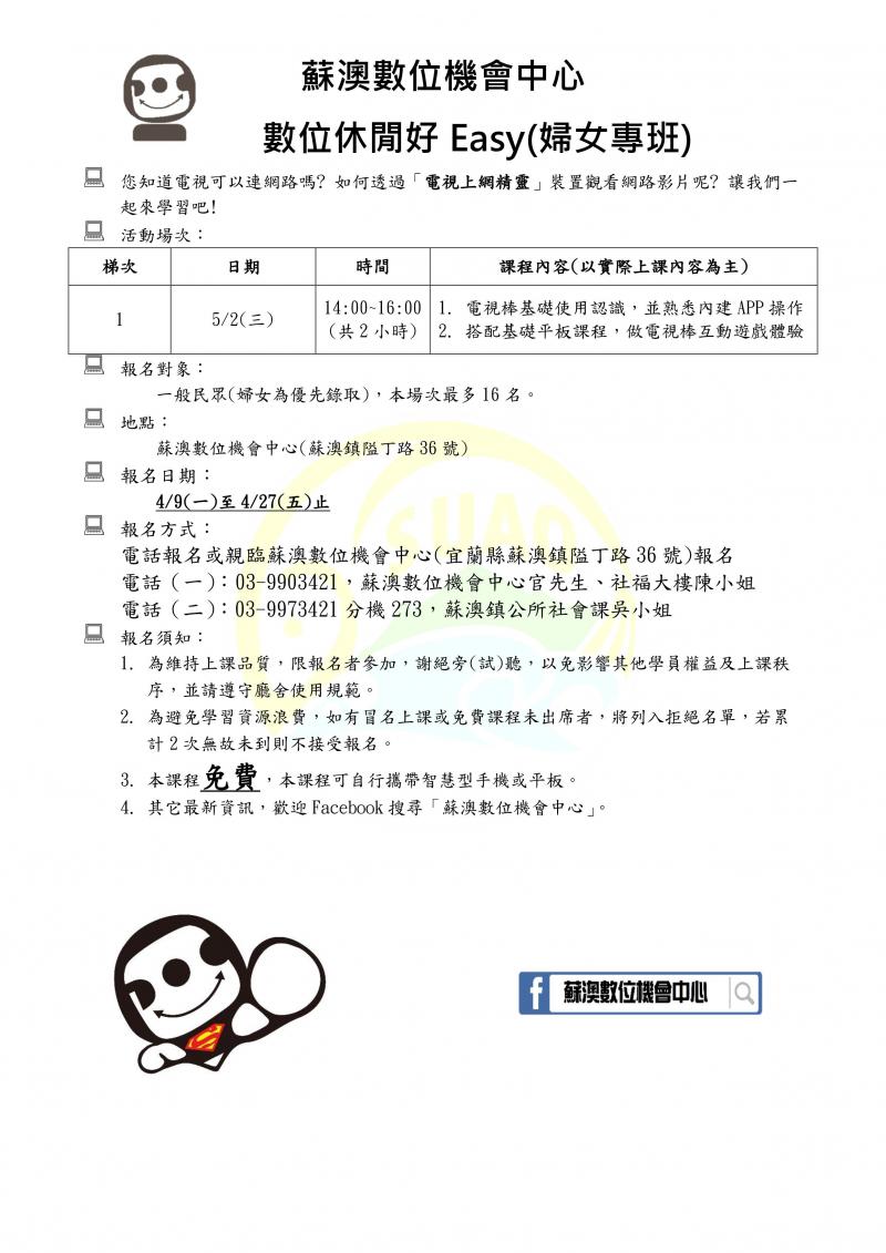 電話(一):03-9903421,蘇澳數位機會中心官先生或社福大樓陳小姐(週一休館)。