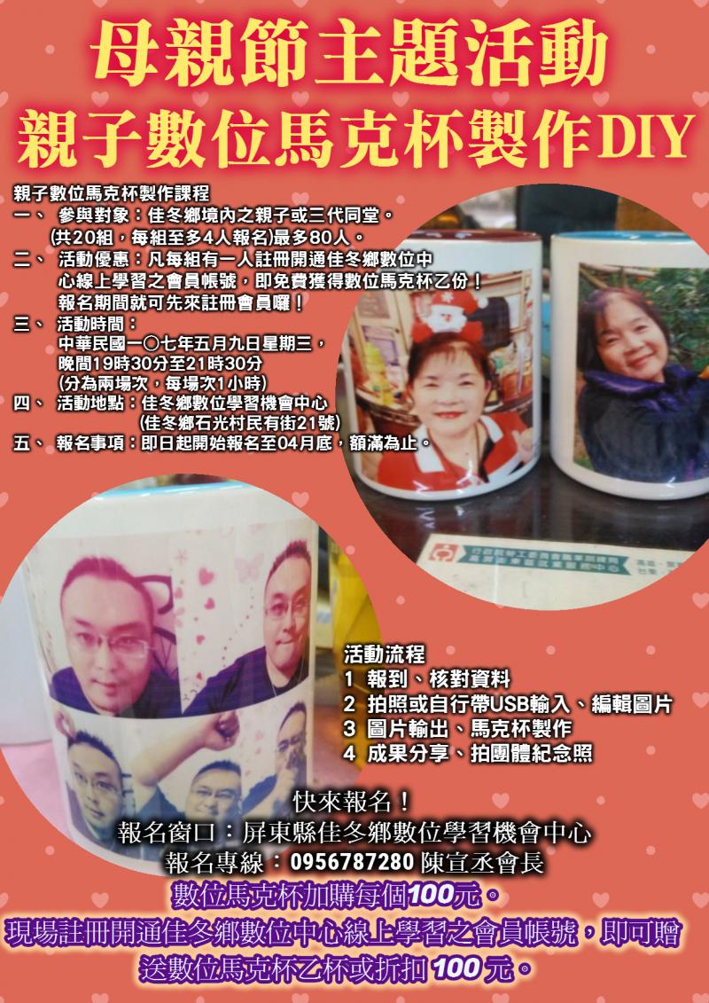 四、活動優惠:凡每組有一人註冊開通佳冬鄉數位中心線上學習之會員帳號,即免費獲得數位馬克杯乙份!報名期間就可先來完成註冊會員囉!現場都有專人指導!