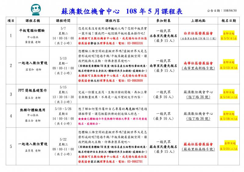 電話(一):03-9903421,蘇澳數位機會中心(分機203)或社福大樓陳小姐(分機201)【週一休館】。