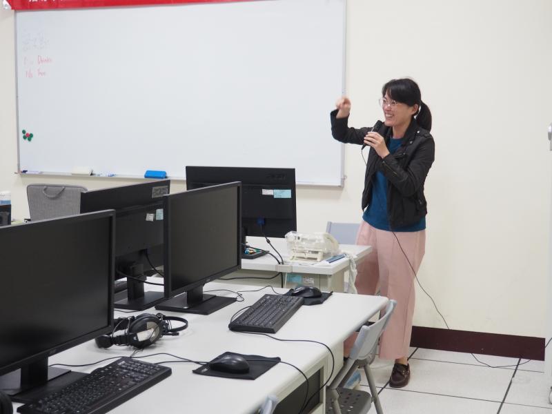 佳芳老師介紹語音導覽相關版面設計,看看學員想要的模式型態。老師也說明PowerPoint功能很多,就從PowerPoint著手囉,從PowerPoint版面設定(16:9),版面配置選〝空白〞;插入圖片再加入文字(選矩形再調整透明度),製作出一張豐面儲存成JPEG檔(220ppi)。