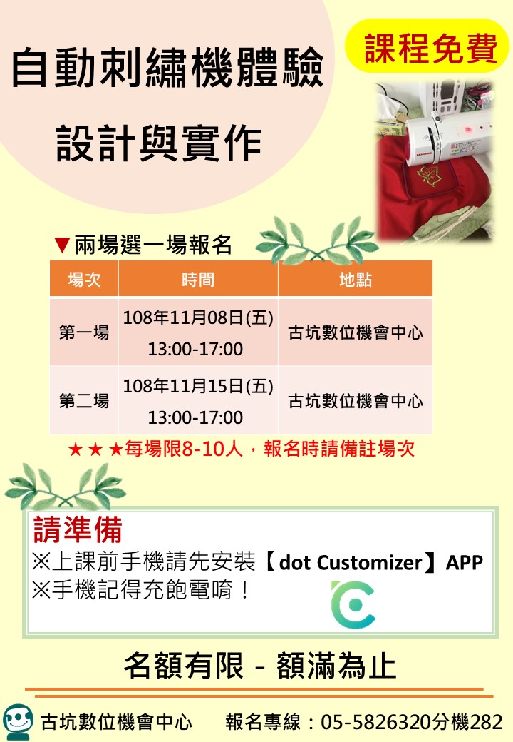 課程名稱:自動刺繡機體驗-設計與實作 上課日期:11月08、15日(五) 上課時間:13:00-17:00 上課地點:古坑數位機會中心 地址:雲林縣古坑鄉西平村中山路135號(地下室;後門進入)
