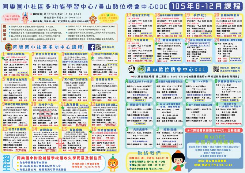最新消息 DOC快訊 ::: <上一則 返回列表 下一則> 夯夯夯~【多功&DOC 105年8-12月課程表】出爐! 發布日期:2016-07-12 人氣:101 暑假除了出遊、出國、玩水、遛(毛)小孩、放空外,您是否覺得有點無聊?來參加同樂多功&DOC的課程斗丟阿! ●首日報名時間:7/23(六)早上10點~12點 ●地點:同樂國小辦公室 ●其他須知及規定詳見海報內容(←點此進入) 為不浪費資源愛護地球,本期只印少量紙本DM及海報,在各個開課地點及宜市文化中心供大家拿取;我們亦相信網路力量是無遠弗屆的,所以請大家動動手指幫忙分享及宣傳,希望更多鄉內及宜蘭地區的民眾能夠看到同樂多功&DOC的用心與付出。歡迎大家一起來學習! <上一則 返回列表 下一則>