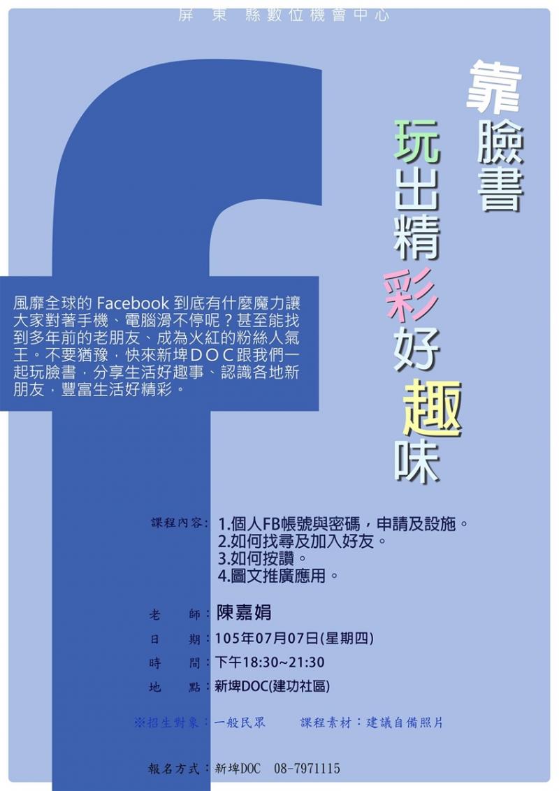 最新消息 DOC快訊 ::: <上一則 返回列表 下一則> 新埤DOC數位課程招生—靠臉書玩出精彩好趣味 發布日期:2016-07-13 人氣:90 新埤DOC數位課程招生_靠臉書 玩出精彩好趣味 熱潮退卻又創新,不斷推層出新,老少咸宜的社群平台-臉書能與朋友分享生活好趣事、認識各地新朋友、精彩豐富生活點滴,還沒有.....體驗過秒按讚快感者,快快來到新埤數位機會中心。 授課教師:陳嘉娟老師 課程日期:07月07日(週四) 課程時間:晚上6:30~9:30 課程地點:建功活動中心數位教室 課程內容: 1.個人FB帳號與密碼,申請及設施。 2.如何找尋及加入好友。 3.如何按讚。 4.圖文推廣應用。 #建議自備照片 <上一則 返回列表 下一則>