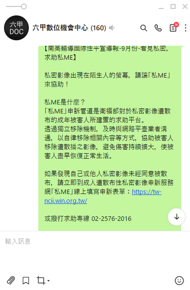 「私ME」申訴管道是衛福部對於私密影像遭散布的成年被害人所建置的求助平台。 透過獨立移除機制,及時與網路平臺業者溝通,以自律移除相關內容等方式,協助被害人移除遭散播之影像,避免傷害持續擴大,使被害人盡早恢復正常生活。 如果發現自己或他人私密影像未經同意被散布,請立即到成人遭散布性私密影像申訴服務網「私ME」線上填寫申訴表單:https://tw-ncii.win.org.tw/ 或撥打求助專線 02-2576-2016 「不轉傳、不上車」,一起還給被害人隱私空間!避免造成被害人更多傷害,進一步阻止憾事發生 如果是未滿 18 歲的孩子遇到相同狀況,一樣可至 iWIN 進行申訴唷!