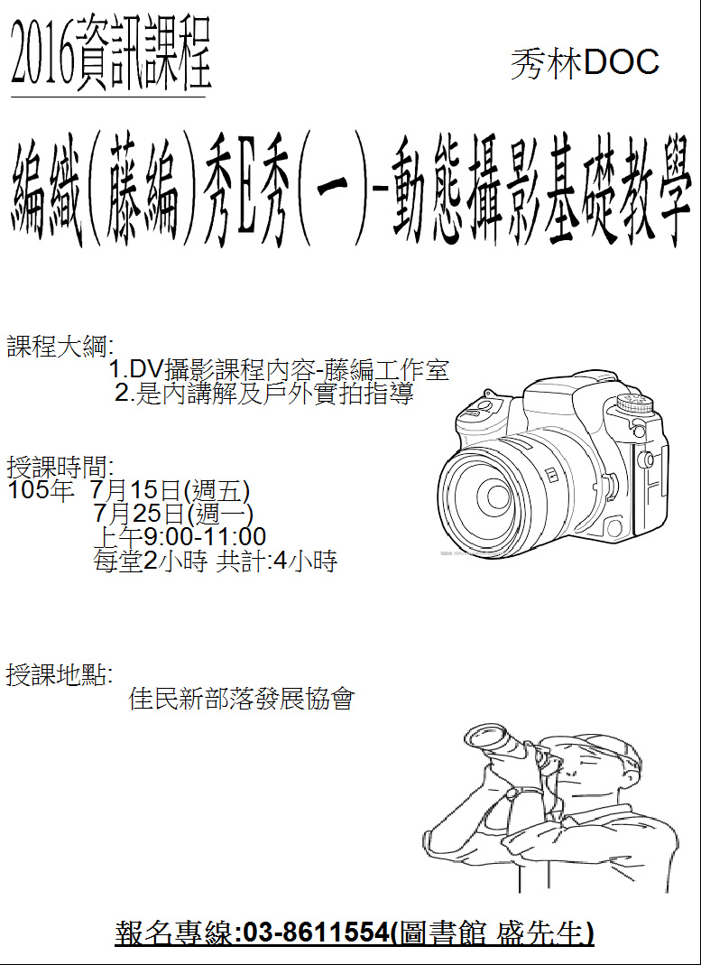 最新消息 DOC快訊 ::: <上一則 返回列表 下一則> 花蓮縣秀林DOC 編織(一)-動態攝影基礎教學課 發布日期:2016-07-10 人氣:151 花蓮縣秀林DOC 編織(一)-動態攝影基礎教學課 開課時間:105年7月15日(五)、7月25日(一) 上午9點~11點 每堂2小時,共計4小時 歡迎來參加! <上一則 返回列表 下一則>