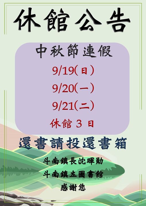 最新消息 DOC快訊 ::: <上一則 返回列表 下一則> 【斗南鎮立圖書館暨斗南數位機會中心】 中秋節休館公告 發布日期:2021-09-17 人氣:160 斗南數位機會中心(斗南DOC)9月份休館日,除表定時間外,配合斗南圖書館開放時間,另於09/21(二)中秋節「全天休館」,造成您的不便,敬請見諒。 <上一則 返回列表 下一則>