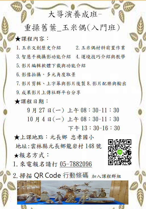 最新消息 DOC快訊 ::: <上一則 返回列表 下一則> 大導演養成班 學會了你也是個大導演 發布日期:2021-09-22 人氣:247 本次課程將使用元長鄉的在地農作物-玉米,我們以玉米葉為主角 拍攝製作過程,並剪輯成影片 你也有個導演夢,想學會怎麼拍攝影片嗎? 那就趕快來報名學習吧! <上一則 返回列表 下一則>