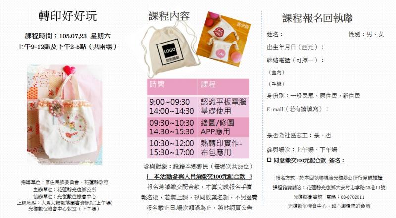 最新消息 DOC快訊 ::: <上一則 返回列表 下一則> 光復DOC-「轉」出特色,「印」出自我,轉印好好玩-布包印製,優質課程,開始招生唷! 發布日期:2016-07-06 人氣:222 光復DOC-「轉」出特色,「印」出自我,轉印好好玩-布包印製,優質課程,開始招生唷! 課程時間:105年7月23日(六) 上午9點~12點及下午2點~5點 (共兩場) <上一則 返回列表 下一則>