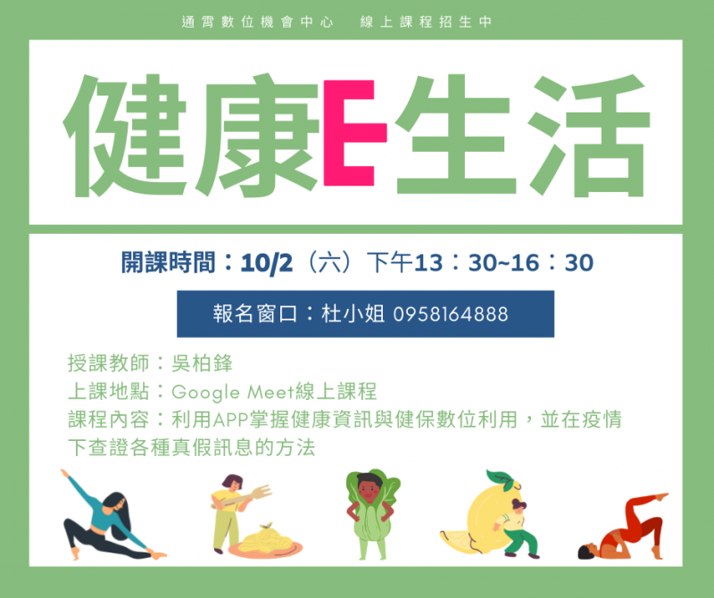 報名窗口:杜小姐 0958164888 上課地點:Google Meet線上課程 課程內容:利用APP掌握健康資訊與健保數位利用,並在疫情下查證各種真假訊息的方法