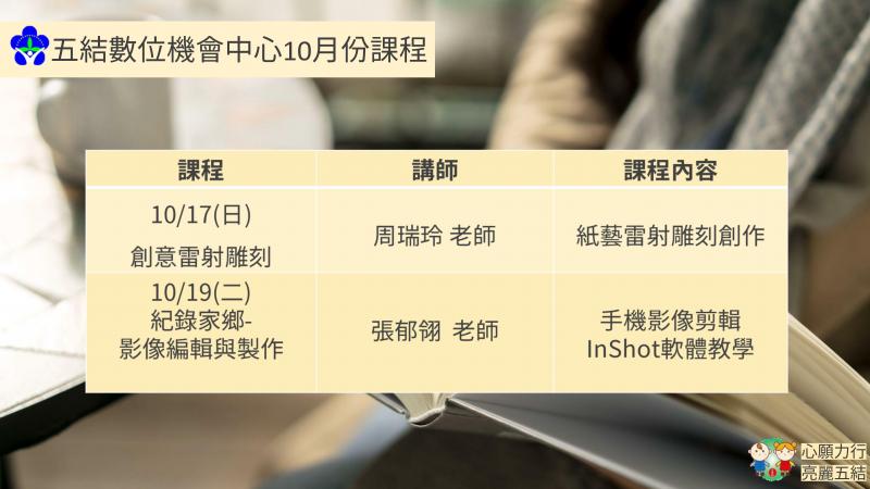 10月份課程: 點我報名→10/17【創意雷射雕刻】實體課程 點我報名→10/19【記錄家鄉-影片編輯與製作】線上課程