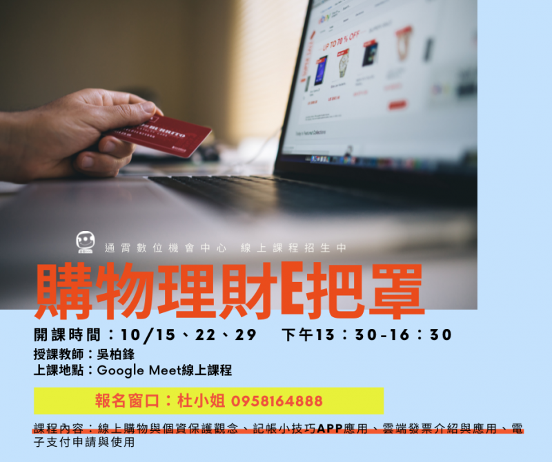 最新消息 DOC快訊 ::: <上一則 返回列表 下一則> 線上課程招生中『購物理財e把罩』 發布日期:2021-10-06 人氣:243 ✩✩10月的線上課程招生中✩✩ 『購物理財e把罩』的課程開課時間如下 10/15、10/22、10/29(五)下午13:30-16:30 授課教師:吳柏鋒 上課地點:Google Meet線上課程 課程內容:線上購物與個資保護觀念、記帳小技巧APP應用、雲端發票介紹與應用、電子支付申請與使用 <上一則 返回列表 下一則>