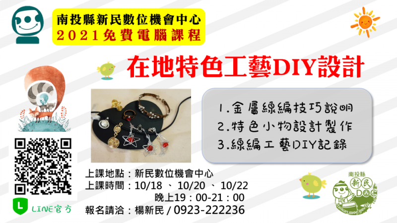 最新消息 DOC快訊 ::: <上一則 返回列表 下一則> 2021新民數位機會中心特色課程-在地特色工藝DIY設計 發布日期:2021-10-06 人氣:183 新民DOC-在地特色課程 ♡在地特色工藝DIY設計♡ 課程內容: 1.金屬線編技巧說明 2.特色小物設計製作 3.線編工藝DIY記錄 ★上課日期:2021/10/18 、 10/20 、 10/22 ★上課時間:晚上19:00-21:00 ★請加入新民DOC-LINE: https://lin.ee/IYSK2QN ~要發送貼圖給我們喔!!! 有任何問題可來電或加LINE詢問 南投縣新民數位機會中心-活動連絡人 ★楊新民/ 0923-222236 <上一則 返回列表 下一則>