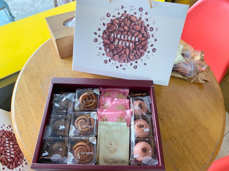原料使用在地小農用心栽種產出的可可,再經由派派來了運用豐富的烘焙經驗,去研發、試吃以及不斷地改良後,製作出有別於市面上的可可肉桂捲、可可酥餅、可可千層酥等商品,以不同的搭配推出了擁有在地特色的中秋禮盒。