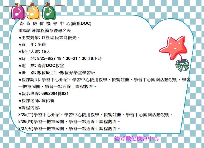 最新消息 DOC快訊 ::: <上一則 返回列表 下一則> 數位E生活~數位好學堂學習班招生簡章 發布日期:2021-08-18 人氣:157 數位E生活~數位好學堂學習班招生簡章 <上一則 返回列表 下一則>