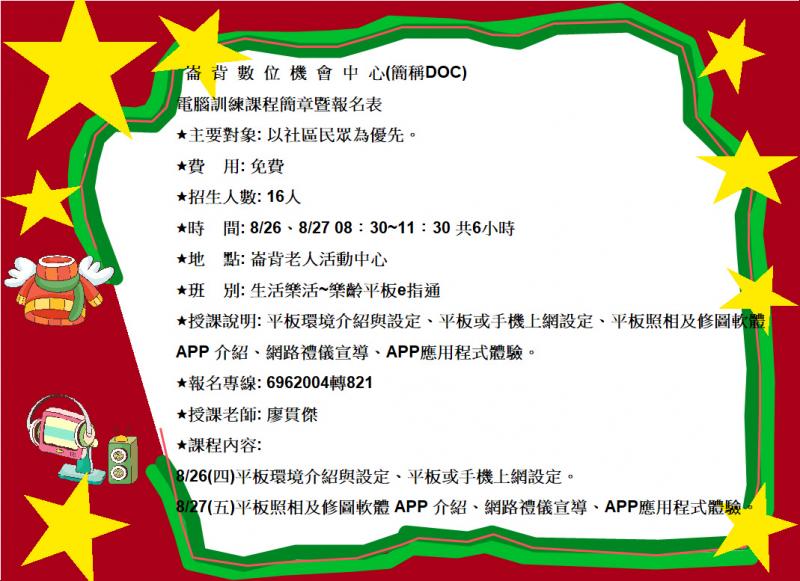 最新消息 DOC快訊 ::: <上一則 返回列表 下一則> 生活樂活~樂齡平板e指通課程招生 發布日期:2021-08-21 人氣:132 生活樂活~樂齡平板e指通課程招生 <上一則 返回列表 下一則>