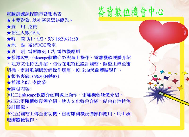 最新消息 DOC快訊 ::: <上一則 返回列表 下一則> 雷射雕刻工坊-雷切機應用招生簡章 發布日期:2021-08-25 人氣:141 雷射雕刻工坊-雷切機應用招生簡章 <上一則 返回列表 下一則>