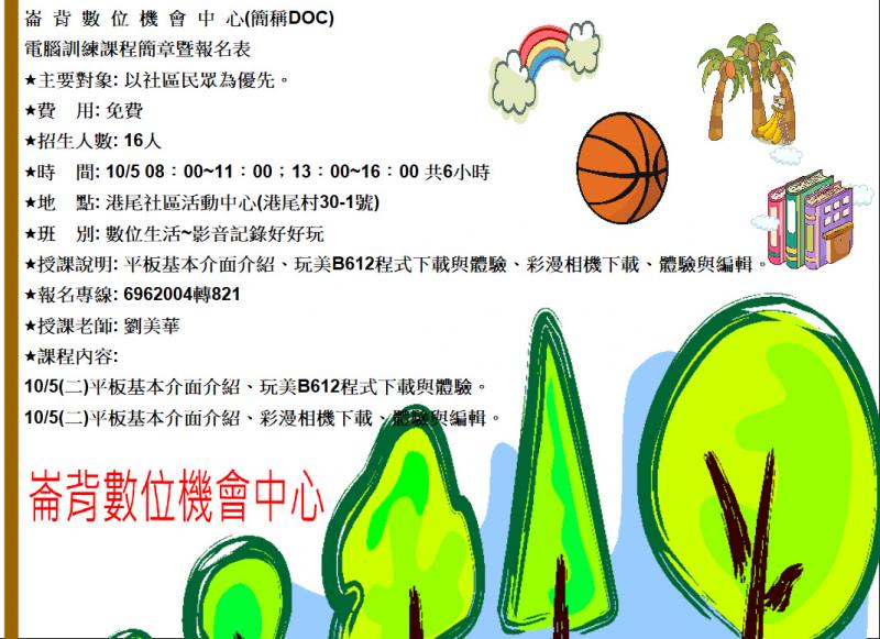最新消息 DOC快訊 ::: <上一則 返回列表 下一則> 數位生活~影音記錄好好玩招生海報 發布日期:2021-09-29 人氣:159 數位生活~影音記錄好好玩招生海報 <上一則 返回列表 下一則>