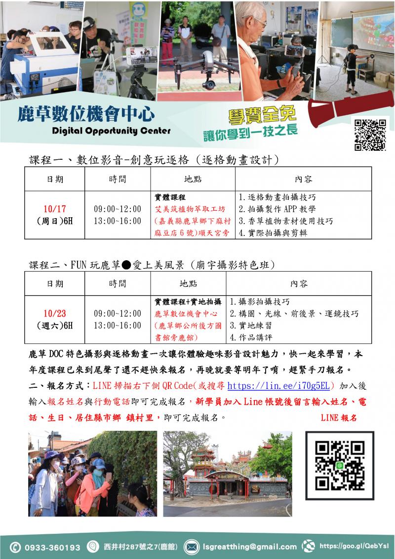 鹿草DOC特色攝影與逐格動畫一次讓你體驗趣味影音設計魅力,快一起來學習,本年度課程已來到尾聲了還不趕快來報名,再晚就要等明年了唷,趕緊手刀報名。實體課程報名人數限制至多15人,講師助教皆已打第一劑疫苗,進入教室皆須按照防疫規定實聯制掃描QR Code、量體溫、手部消毒並全程配戴口罩,歡迎大家一起來學習。