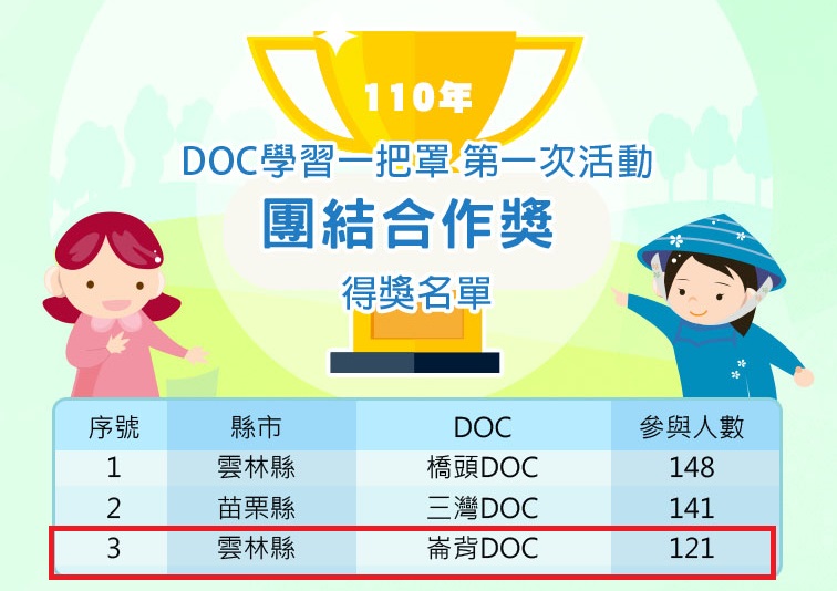 最新消息 DOC快訊 ::: <上一則 返回列表 下一則> 教育部110年度學習中心第一次「學習一把罩-闖關學習活動」、「學習一點通-數位學習積分賽」全國團結合作獎獲獎名單 發布日期:2021-10-13 人氣:158 學習一把罩-闖關學習活動得獎名單學習一點通-數位學習積分賽得獎名單 <上一則 返回列表 下一則>