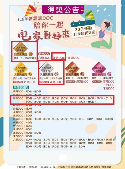 最新消息 DOC快訊 ::: <上一則 返回列表 下一則> 110年彰雲嘉DOC陪你一起宅家動起來 30日運動打卡競賽活動 得獎公告 發布日期:2021-10-11 人氣:136 110年彰雲嘉DOC陪你一起宅家動起來 30日運動打卡競賽活動 得獎公告 <上一則 返回列表 下一則>
