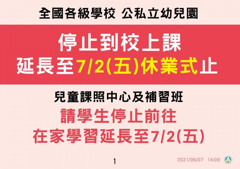 最新消息 DOC快訊 ::: <上一則 返回列表 下一則> 【教育部通報】全國疫情警戒均提升至第三級(5/19 - 5/28 - 延長至6/14 - 延長至7/2) 發布日期:2021-06-08 人氣:126 【教育部訊息公告】110年6月7日 因應嚴重特殊傳染性肺炎疫情,全國實施疫情警戒第三級時間延長,為降低群聚感染之風險,維護學校師生健康及學習權益,教育部考量學期完整性,於本(7)日宣布,全國各級學校及公私立幼兒園109學年度第2學期停止到校(園)上課之期間,延長至110年7月2日止(高中以下學校休業式),學生改採居家線上學習;兒童課後照顧服務中心、補習班等各類教育機構亦請所有學生停止前往,留在家中學習;學校實施線上教學方式、教職員工出勤管理及教師授課形式、家長服務措施,請依先前已實施方式辦理。 <上一則 返回列表 下一則>