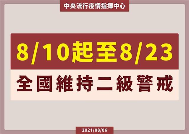 中央流行疫情指揮中心表示,考量國內疫情趨於穩定及參酌其他國家之防疫措施調整經驗,經與相關單位溝通討論及評估後,宣布自8月10日至8月23日維持疫情警戒標準為第二級,相關規定如下: