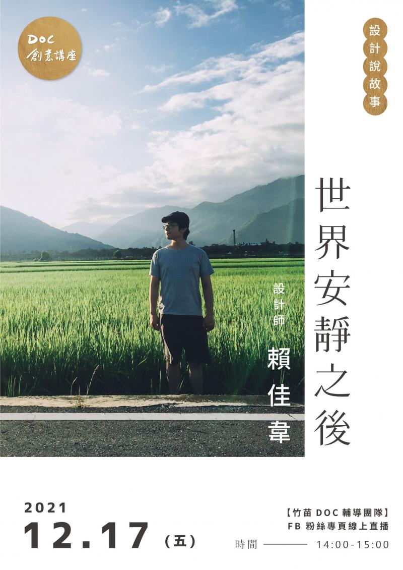 最新消息 DOC快訊 ::: <上一則 返回列表 下一則> DOC 創意講座-12月17日 (五) 14:00-設計說故事 發布日期:2021-12-15 人氣:235 設計說故事|世界安靜之後 #線上講座 #請鎖定竹苗DOC輔導團隊粉絲專頁 12月17日 (五) 14:00 賴佳韋 設計師 我想「設計」並不偉大,但我們總冀望著「設計」真能改變這個世界,讓它變得更美好。設計師永遠都不可能成為那個真正革新世界的那個英雄,但我們可以為那些可能的英雄們搭建一座美麗的舞台,為他們鋪路。 ── 賴佳韋 <上一則 返回列表 下一則>